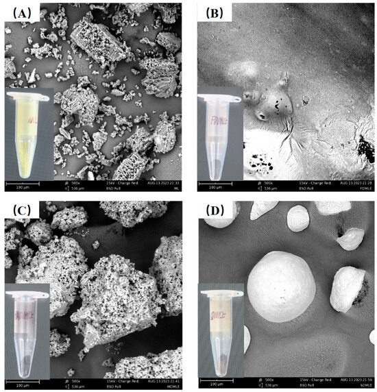 The SEM morphology of MLE by different drying methods. The figure marked with (A–D) shows the morphology of ML, FDMLE, HADMLE, and SDMLE, respectively.