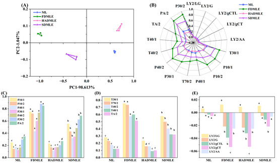 (A) Principal component analysis (PCA) plot of MLE prepared by different drying methods using an electronic nose. (B) Radar chart. (C) Changes in the signal responses of electronic nose sensors P10/1, P10/2, P40/1, P30/1, P40/2, P30/2, and PA/2. (D) Changes in the signal responses of electronic nose sensors T30/1, T70/2, T40/2, T40/1, and TA/2. (E) Changes in the signal responses of electronic nose sensors LY2/LG, LY2/G, LY2/gCTL, LY2/gCT, and LY2/AA. Different letters of a–c indicate statistically significant differences (p < 0.05).