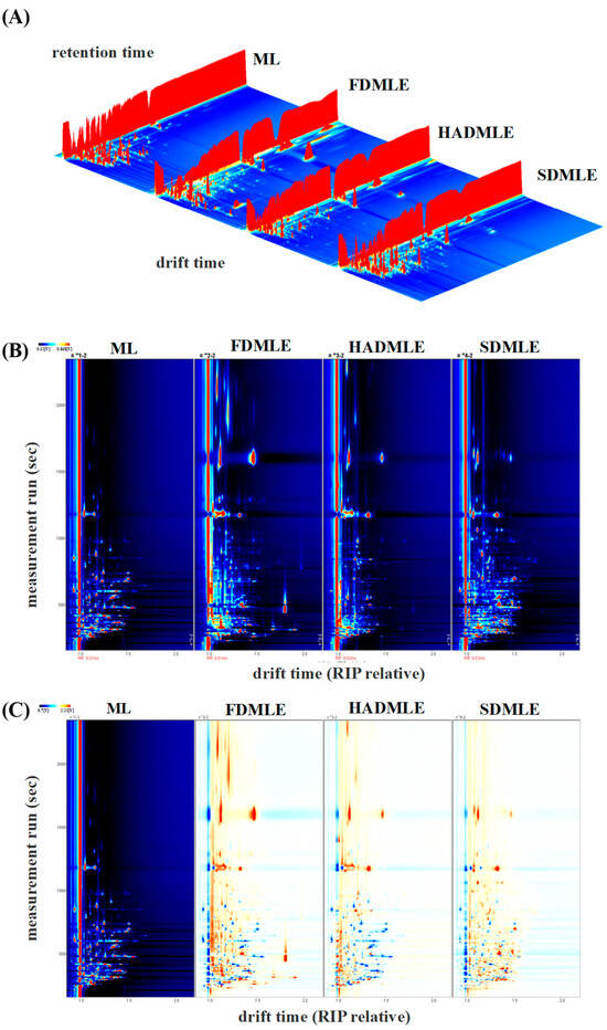 Three-dimensional GC-IMS spectra of VOCs in MLE prepared under different drying methods. (A) Original three-dimensional GC-IMS spectra. (B) Differential spectra of VOCs in MLE. (C) Qualitative analysis.