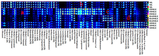 Fingerprint of volatile flavor substances in MLE prepared by different drying methods. a, b, c and d represent the special VOCs of ML, FDMLE, HADMLE and SDMLE, respectively.