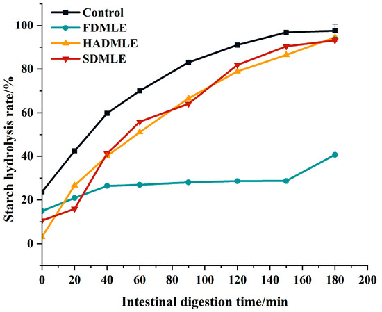 Therefore, while ensuring the flavor of MLE, we further evaluated the effects of MLE prepared by different drying methods on corn starch digestion using an in vitro simulated gastrointestinal digestion experiment, as shown in Figure 6. Within 0~90 min, the starch hydrolysis rate increased rapidly, and after 90 min, it showed a slow rise and gradually leveled off. The starch hydrolysis rates of MLE prepared by different drying methods were lower than those of the control group at various time points. The change curves of HADMLE and SDMLE were similar, but FDMLE exhibited a smaller variation in starch hydrolysis rate within 120 min. At 180 min, there was no significant difference between HADMLE and the control group, but FDMLE and SDMLE showed significant reductions. It was speculated that MLE can act as a carbohydrate digestive enzyme inhibitor, possibly by competitively binding to the active sites of digestive enzymes with the substrate starch, thereby slowing down the starch digestion rate [55]. Among them, FDMLE exhibited the most significant inhibitory effect on starch digestion (p < 0.05). Liu et al. [10] investigated the effects of different drying methods on the phenolic components and in vitro hypoglycemic activity of pulp extracts from two bayberry cultivars, and demonstrated that freeze-dried samples possessed significantly higher TFC and TAC, and exhibited more potent antioxidant and hypoglycemic activities than hot-air-dried samples (p < 0.05). Inhibition of the starch digestion activity is found to be effective to decrease the postprandial hyperglycemia, and it is regarded as an important treatment strategy in type II diabetes. Meanwhile, combined with Table 2, it is speculated that flavonoids are the main contributors to inhibiting starch digestion of mulberry leaf extract.