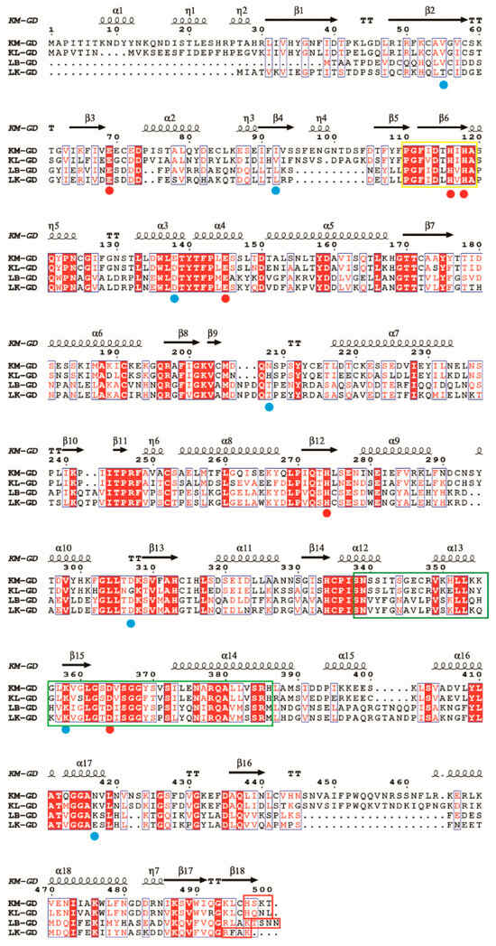 Figure 1. Multiple sequence alignment of guanine deaminase from various sources. KM-GD: amino acid sequence of GDA from Kluyveromyces marxianus; KL-GD: amino acid sequence of GDA from Kluyveromyces lactis; LB-GD: amino acid sequence of GDA from Lactobacillus buchneri; LK-GD: amino acid sequence of GDA from Lentilactobacillus kefiri. Around 106 conserved amino acid sequences are labeled using red backgrounds, conserved substitutions are labeled with blue boxes, residues binding to the substrate and forming hydrogen bonds are marked with blue-filled circles, and amino acid residues within the active site are depicted using red-filled circles. The Zn2+-binding domain (yellow square) is well conserved among the four species, while the CRMP homology (green squares) and the PDZ-binding domains (red squares) are less conserved. The figure was built using ESPript through the online ESPript3 server (http://espript.ibcp.fr/ESPript/ESPript/, accessed on 11 December 2024).