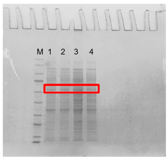 Figure 2. SDS-PAGE of guanine deaminase expressed in E. coli. M: marker (9–170 kDa); 1: KM-GD; 2: KL-GD; 3: LB-GD; 4: LK-GD. The guanine deaminases are labeled with red box.