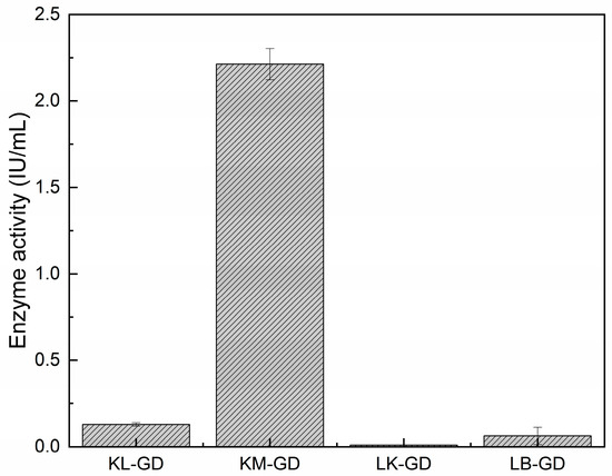 Crude enzyme activity was tested at 37 °C and pH 7.0. Figure 3 shows that KM-GD (2.21 IU/mL), KL-GD (0.13 IU/mL), and LB-GD (0.06 IU/mL) could be expressed in E. coli and catalyze guanine degradation. KM-GD showed the greatest guanine degradation activity. The guanine deaminases of Escherichia coli and Kluyveromyces lactis were also cloned and overexpressed in Escherichia coli, but the enzyme activity was not mentioned. Arxula adeninivorans recombinant guanine deaminase (Agdap) expressed in Escherichia coli exhibited an enzyme activity of 0.32–0.43 U/mL. The enzyme activity of KM-GD is 7 times higher than that of Agdap [15,34]. Therefore, KM-GD was chosen for subsequent experiments and characterization.