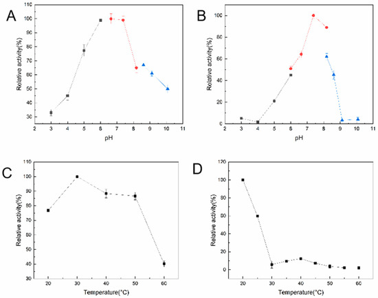 Figure 4. Temperature and pH effects on activity and stability of KM-GD. (A) Activity–pH profile; (B) stability–pH profile; The sodium acetate (pH 3.0–5.0) is black line, sodium phosphate (pH 5.5–8.0) is red line and Tris-HC1 (pH 8.5–10.0) is blue line; (C) activity–temperature profile; (D) stability–temperature profile.