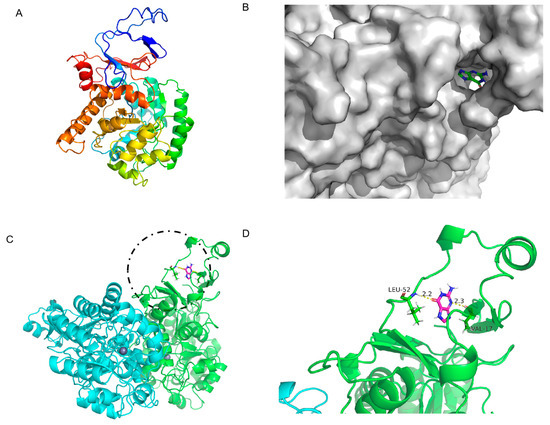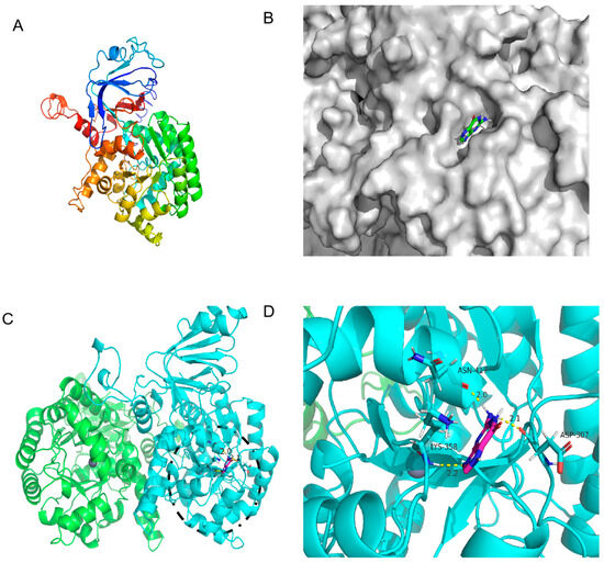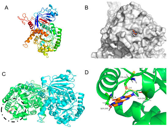 Figure 5. The 3D structure of KM-GD guanine deaminase homology modeling and monomer structure. (A) Monomer structure of KM-GD; (B) protein surface model of KM-GD and guanine; (C) structures of KM-GD oligomers (subunits A and B are marked in different colors), the binding of enzyme and substrate is marked by black circles and shown enlarged in the Figure 5D; (D) hydrogen bonding between KM-GD and guanine.