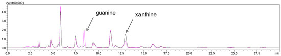 Figure 8. HPLC analysis of guanine of saccharified wort: untreated (black line); treated using KM-GD (purple line). Guanine peak decreased and xanthine peak intensity increased, suggesting the conversion of guanine into xanthine.