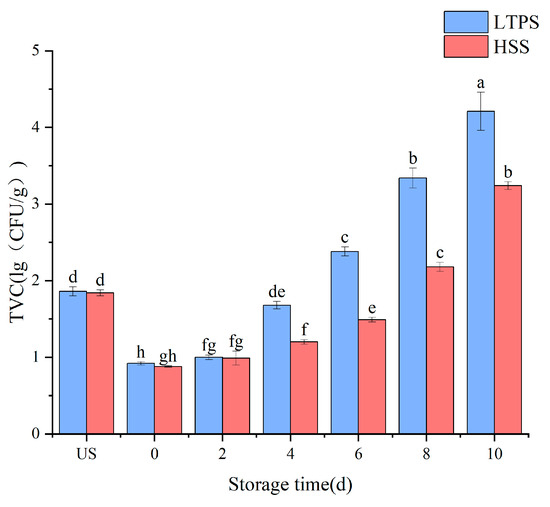 Impact of different sterilization on the TVC of tomato-stewed beef brisket. Note: different letters denote statistically significant differences (p < 0.05) between treatments.