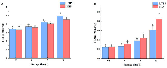 Impact of different sterilization treatments on the TBARS (A) and TVB-N (B) of tomato-stewed beef brisket during storage. Note: different letters indicate statistically significant differences (p < 0.05) between the treatments.