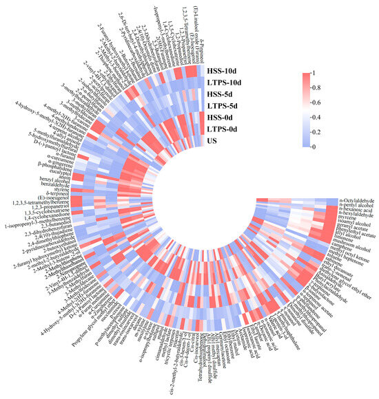 Figure 3 shows heatmaps of the volatile compounds in beef brisket during the 10-day storage period after different sterilization procedures. A total of 165 compounds were identified. Overall, the contents of volatile compounds decreased as storage time increased, indicating dissipation of the aroma. Additionally, there were greater numbers of volatile compound types in the HSS-treated samples compared with the LTPS-treated samples.