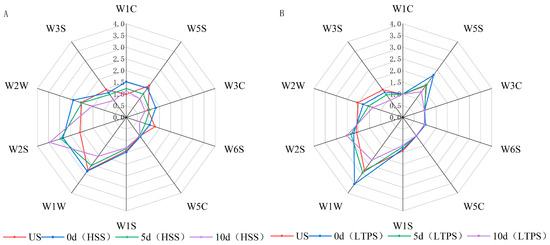 Radar plot of E-nose for HSS-treated samples (A) and LTPS-treated samples (B).