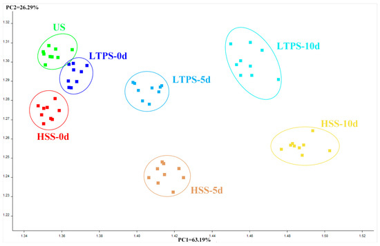 A principal component analysis (PCA) biplot was constructed to intuitively interpret the relationship between different types of samples and e-nose sensors. As illustrated in Figure 5, PC1 and PC2 accounted for 63.19% and 26.29% variance, respectively. On day 0, US, LTPS, and HSS samples clustered closely together, with US and HSS exhibiting the highest similarity. However, with an increase in storage time, the distance between HSS and US samples on the PC1 axis and PC2 axis gradually increased, reflecting growing differences in volatile flavor profiles. This observation suggested that compared to US controls, HSS-treated samples experienced more pronounced changes in volatile compounds during storage. In contrast, LTPS samples exhibited minimal shifts in PCA space over time, highlighting their superior stability in preserving aroma. This result aligned with the hypothesis that LTPS mitigates oxidative degradation and microbial activity, thereby maintaining the original volatile composition of tomato-braised beef brisket more effectively than HSS. The observed clustering patterns further support the conclusion that LTPS is a promising sterilization method for preserving the sensory quality in ready-to-eat meat products during extended storage.
