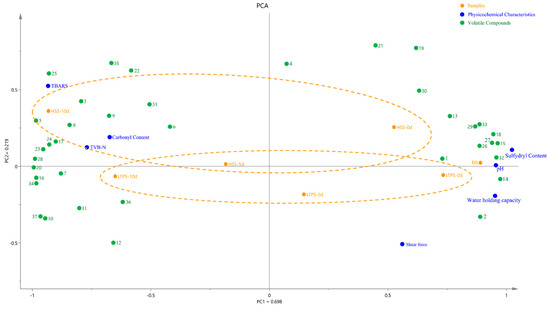 Furthermore, increased TBARS, TVB-N, and carbonyl content were detected in both HSS- and LTPS-treated samples at the end of storage (10 days), suggesting advanced lipid and protein oxidation. The close clustering of these samples suggests a potential synergistic interaction between protein and lipid oxidation pathways [41], which could contribute to accelerated quality deterioration in pre-prepared dishes. This interplay between oxidative mechanisms warrants further investigation to better understand its impact on sensory and nutritional degradation.