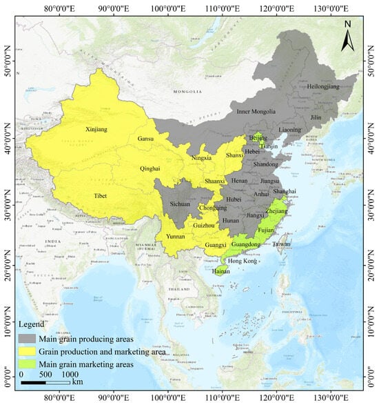 According to the Guiding Opinions on the Establishment of Functional Grain Production Areas and Important Agricultural Product Production Protection Areas issued by the State Council in 2017, the Chinese mainland is divided into three functional grain areas, namely, the main grain production area, the grain production and marketing balance area, and the main grain marketing area, by comprehensively taking into account the economic situation, agricultural cultivation capacity, resource conditions, as well as the production and consumption of grains of the provinces (autonomous regions and municipalities directly under the central government) (Figure 1). Specifically, the main grain-producing areas are concentrated in 13 provinces in the central and northeastern parts of the country, such as Henan, Shandong, Hebei, Anhui, Jiangsu, Jilin, and Heilongjiang. Most of the provinces have a favorable temperate monsoon climate, fertile soil, and abundant water resources, which are extremely suitable for the extensive cultivation of grain crops and have high potential for grain production. The main production areas are not only able to achieve self-sufficiency in food production, but also to provide adequate food support for other regions, and they are the core areas of the national food supply. Grain-producing and marketing areas are located mainly in the western and northwestern provinces of Xinjiang, Inner Mongolia, Ningxia, Gansu, and Qinghai, where, because of the constraints imposed by natural conditions such as topography and climate, the land is relatively decentralized, and grain production is able to satisfy only local demand, making a relatively small contribution to the country’s total grain output. The main grain marketing areas, on the other hand, are concentrated in the southeastern coastal provinces with rapid economic development, including Guangdong, Fujian, Zhejiang, Shanghai, Hainan, Beijing, and Tianjin, where the reduction in the area of arable land as a result of the rapid development of urbanization and industrialization, coupled with large populations and limited land resources, has led to a large gap between food production and demand in the region.