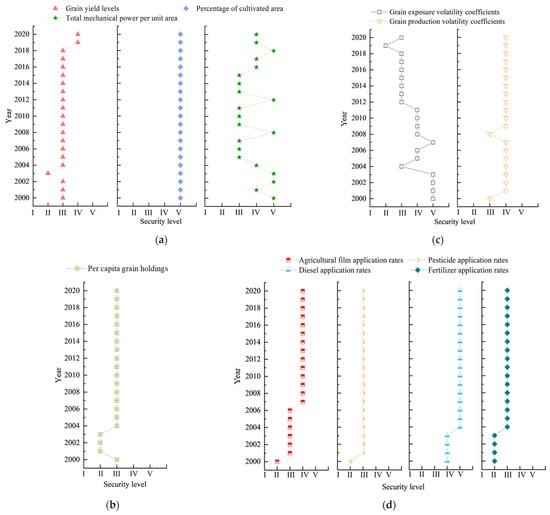 In the grain production stability subsystem, the rank of the grain exposure volatility coefficients () showed a fluctuating downward trend, which may be related to the increase in the frequency of agricultural planting disasters and the intensification of climate fluctuations in recent years [46]. The safety level of grain production volatility coefficients, on the other hand, fluctuates less, with the exception of 2000 and 2008, when it was at level III (basically safe) status, and the rest of the years were at level IV (relatively safe) status. In the food production continuity subsystem, on the other hand, the safety levels of agricultural film application rates (), diesel application rates (), and fertilizer application rates () showed an increasing trend in 2000–2020 and have been in a stable state since 2004 (agricultural film application rates have been in a steady state since 2007), reflecting the rapid advancement of agricultural modernization and national policy support [47]. In addition, the safety level of pesticide application rates () has remained relatively stable, and except for 2000, when it was at level II (critically safe), it was at level III (basically safe) in all other years, indicating that the use of pesticides has been restricted under the promotion of agro-environmental protection and green agriculture and that their safety levels have tended to stabilize or improve.