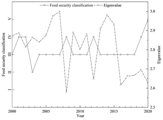 where is the average of the composite relevance of the object to be evaluated, , with respect to the rank ; is the eigenvalue of the rank variable, which is used to measure the level of the object element in the high, medium, and low levels. Within the same class, the smaller the eigenvalue, the higher the level of food security, and the larger the eigenvalue, the lower the level of food security (Table 2). Food security assessment is more accurate when is combined with . It is assumed that the food security level is , and belongs to the interval ; when = , food security is at the medium level of ; if = , then food security is a high level in the n-level; if = , then food security is a low level in the n-level.