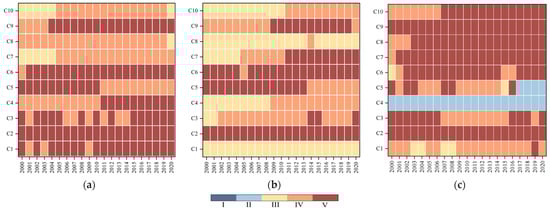 Heat map of food security evaluation indicator levels for different food functional areas in 2000–2020. (a) Main grain producing areas; (b) grain production and marketing area; (c) main grain marketing areas.