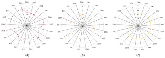 Radar map of food security evaluation ratings of different food functional zones in 2000–2020. (a) Main grain producing areas; (b) grain production and marketing areas; (c) main grain marketing areas.