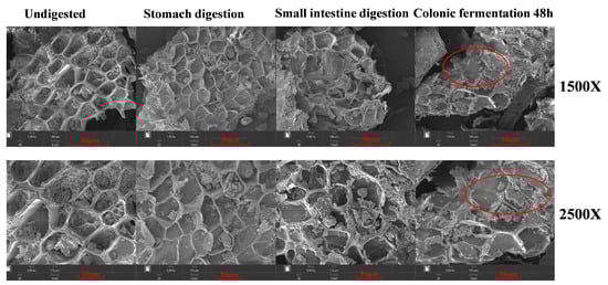 SEM micrographs of undigested, digested, and fecal fermented BBP samples (The red circles indicate that the integrity of the overall structure of dietary fiber was disrupted).