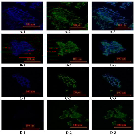 Confocal micrographs of undigested, digested, and fermented BBPs samples. (A-1) Fluorescence image of the bound phenolics of Undigested BBPs; (A-2) Fluorescence image of the dietary fibers of Undigested BBPs; (A-3) Fused image of fluorescence images of bound phenolics and dietary fibers of Undigested BBPs; (B-1) Fluorescence image of the bound phenolics of BBPs after in vitro stomach digestion; (B-2) Fluorescence image of the dietary fibers of BBPs after in vitro stomach digestion; (B-3) Fused image of fluorescence images of bound phenolics and dietary fibers of BBPs after in vitro stomach digestion; (C-1) Fluorescence image of the bound phenolics of BBPs after in vitro intestine digestion; (C-2) Fluorescence image of the dietary fibers of BBPs after in vitro intestine digestion; (C-3) Fused image of fluorescence images of bound phenolics and dietary fibers of BBPs after in vitro intestine digestion; (D-1) Fluorescence image of the bound phenolics of BBPs after colonic fermentation 48 h; (D-2) Fluorescence image of the dietary fibers of BBPs after colonic fermentation 48 h; (D-3) Fused image of fluorescence images of bound phenolics and dietary fibers of BBPs after colonic fermentation 48 h. Dietary fiber was dyed in green and phenolics were dyed in blue due to their autofluorescence.