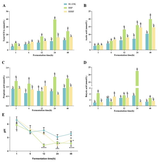 Changes in SCFAs and pH during colonic fermentation of barley bound phenolics. (A) Content of total SCFAs in fermentation solution. (B) Content of acetic acid in fermentation solution. (C) Content of propionic acid in fermentation solution. (D) Content of butyric acid in the fermentation solution. (E) Changes in pH during in the fermentation solution. * Indicates comparison with blank group, *: p < 0.05, ****: p < 0.0001. Different letters represent significant differences between the two groups (p < 0.05).