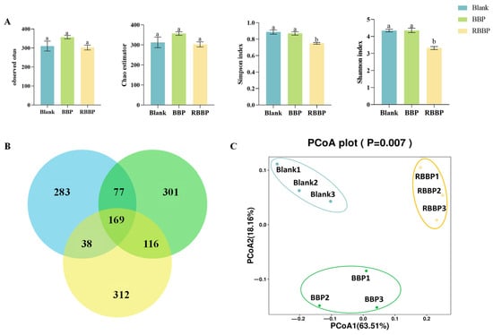 Fermentation behavior of BBPs and RBBPs in gut microbiota diversity. (A) Alpha diversity analysis of gut microbiota: observed OTU index curve, Chao1 index curve, Simpson index curve, Shannon index curve; (B) OTU diagram; (C) Bray–Curtis PCoA analysis for all samples in terms of relative abundance Different letters represent significant differences between the two groups (p < 0.05).