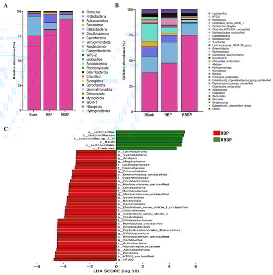 The gut microbiota composition of fecal fermented BBPs and RBBPs at different levels. (A) Changes in gut microbiota at the phylum level. (B) Changes in gut microbiota at the genus level. (C) Circos graphs showing the distribution proportion of dominant gut microbiota in each group on the genus level.
