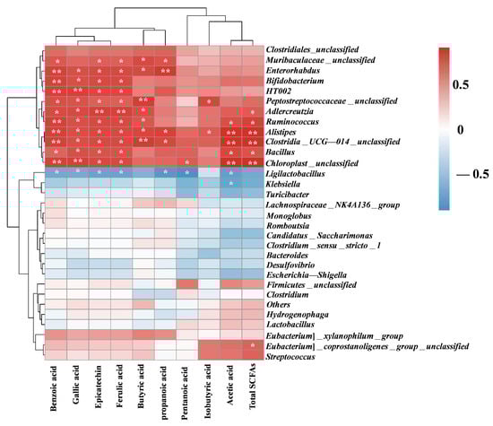Spearman correlation analysis of the top 30 genera and metabolites in relative abundance. Red color represents a positive correlation, and blue color represents a negative correlation. The shades of color represent the level of significance. * p < 0.05; ** p < 0.01.