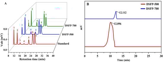 (A) Monosaccharides (peak identification: 1, D-mannose; 2, L-rhamnose; 3, D-glucose acid; 4, D-galacturonic acid; 5, D-glucose; 6, D-galactose; 7, L-arabinose) and (B) the Mws of DSFP-500 and DSFP-700.