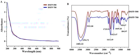 As shown in Figure 2A, the UV-Vis spectra of DSFP-500 and DSFP-700 were basically the same; there were no obvious corresponding absorption peak around 260, 280 and 520 nm. The results showed that the degraded polysaccharides did not contain protein, nucleic acid and anthocyanins.