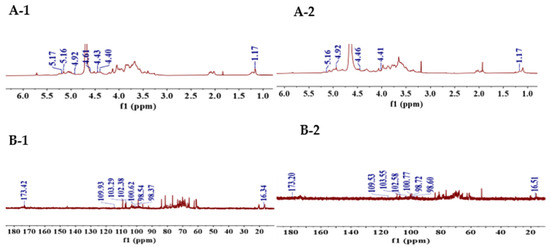 (A) 1H NMR spectra of DSFP-500 (A-1) and DSFP-700 (A-2); (B) 13C NMR spectra of DSFP-500 (B-1) and DSFP-700 (B-2); (C) HSQC of DSFP-500 (C-1) and DSFP-700 (C-2); (D) 1H–1H COSY of DSFP-500 (D-1) and DSFP-700 (D-2).