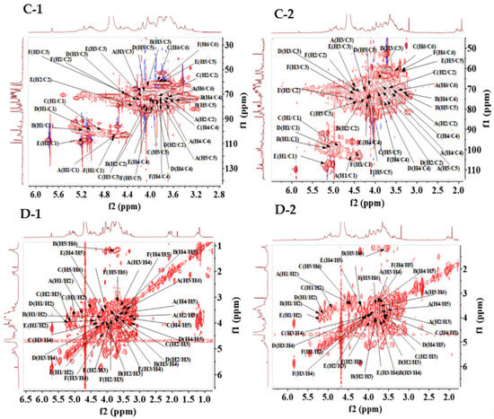 1D and 2D NMR were used to identify the configuration and arrangement of polysaccharides. As shown in Figure 3A,B, the 1H and 13C NMR spectra of the two degraded polysaccharides exhibited the same characteristic signal peaks, which were mainly distributed in δH 3.0–5.3 ppm and δC 60.0–110.0 ppm. Based on the resonance signal region of anomeric protons (δH 4.5–5.5 ppm) and anomeric carbon (δC 90.0–110.0 ppm), α-/β-configurations were confirmed [28,34] in degraded polysaccharides. This result agreed with the FT-IR analysis in Section 3.2.1. Based on HSQC spectra (Figure 3C), the chemical shifts in δ5.16/109.93, δ4.43/103.29, δ4.40/102.38, δ4.61/100.62, δ4.92/98.54 and δ5.17/98.37 ppm in DSFP-500, and δ5.16/109.53, δ4.46/103.55, δ4.41/102.58, δ4.66/100.77, δ5.16/98.72 and δ4.92/98.60 ppm in DSFP-700, were assigned to the anomeric region of H1/C1. These data also suggested that both DSFP-500 and DSFP-700 had the same type of sugar residues; this was consistent with the monosaccharide composition results. According to the COSY spectrum (Figure 3D), all the proton chemical shifts (H1 to H6) were claimed, and six sugar residues including → 3,6)-β-D-Galp-(1 → [34], → 2)-α-L-Rhap-(1 → [17,29], → 3)-β-D-Manp-(1 → [18], → 4)-α-D-GalpA-(1 → [29], α-L-Araf-(1 → [30] and → 4)-β-D-Glcp-(1 → [17,18] were identified (as shown in Table 2). The residues in DSFP-500 and DSFP-700 were the same as that of the native polysaccharide [17].