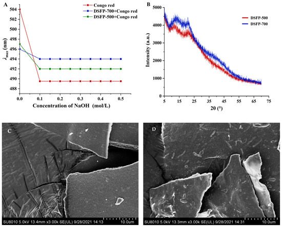 Effect of DSFP-500 and DSFP-700 on the absorbance of Congo red at various NaOH concentrations (A); X-ray diffraction of DSFP-500 and DSFP-700 (B); SEM images of DSFP-500 (C) and DSFP-700 (D) (magnification 3000×, scale bar 100 μm).