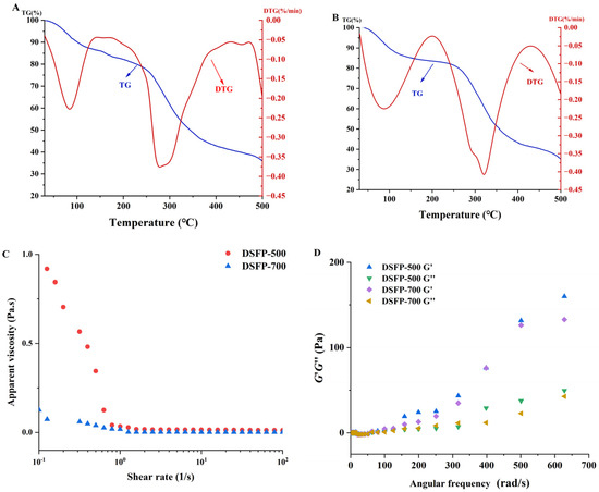 TG and DTG curves of DSFP-500 (A) and DSFP-700 (B); rheological behaviors of DSFP-500 and DSFP-700; (C) steady shear flow curve and (D) G′ and G″ with angular frequency.