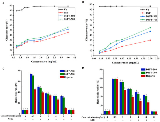 Scavenging activities of two degraded polysaccharides on ABTS+• (A) and DPPH• (B). Hemolysis ratio of two degraded polysaccharides through classic pathway (C) and alternative pathway (D). Values with different letters in columns represent differences (p < 0.05).