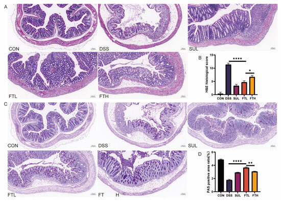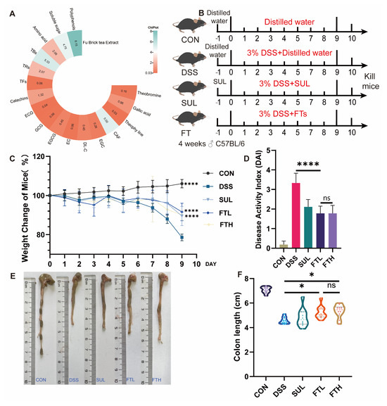 The experimental design is shown in Figure 1B. After 1 week of adaptive feeding, mice were randomly divided into the normal control group (CON), DSS enteritis model group (DSS), positive control group (sulfasalazine SUL), 200 mg/kg FBT group (FTL), and 400 mg/kg FBT group (FTH), with 10 mice in each group. The experimental period lasted 9 days. The drinking water of the mice in the CON group was distilled water. The drinking water of the mice in the DSS group, SUL, and FBT treatment groups for the first 7 days was distilled water with 3% DSS added to establish the mice colitis model. The mice in the FBT group were administered FBT water extract via gavage at doses of 200 mg/kg and 400 mg/kg, respectively, throughout the entire experimental period. The mice in the CON group and DSS group received the same volume of distilled water by gavage. The mice in the SUL group received the same volume of sulfasalazine by gavage. In addition, we monitored mice daily for symptoms of colitis, including body weight, fecal characteristics, and bleeding. After the experiment, the mice were anesthetized with 1% pentobarbital, and eyeball blood samples were collected. The contents of the colon and cecum were collected, and a part of the colon was cryopreserved at −80 °C for subsequent use. The other part of the colon was fixed in tissue fixative, and then tissue sections were performed to observe the colon morphology.