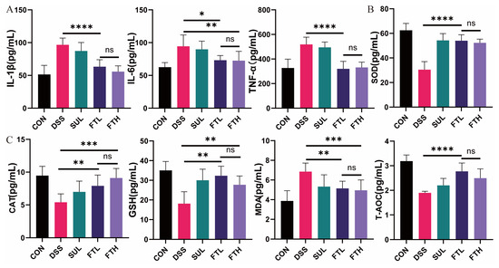 Effects of FBT on serum and intestinal antioxidant factors in mice with DSS-induced colitis. (A) Contents of inflammatory factors in mice serum. (B,C) Contents of oxidative stress-related indicators in mice intestines. *, p < 0.05; **, p < 0.01; ***, p < 0.001; ****, p < 0.0001; ns indicates that the difference is not significant.