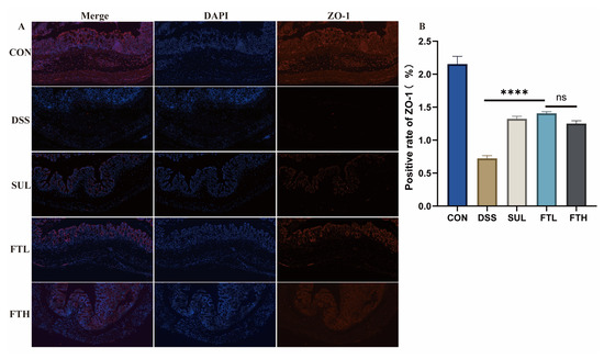 Morphological analysis revealed that oral administration of FBT could reduce the damage of DSS to colonic goblet cells and mucosal proteins; we, therefore, speculated that FBT extract may also have a certain protective effect on intestinal barrier proteins. Thus, we used immunofluorescence technology to detect the expression of the key barrier protein ZO-1 in the colon of enteritis mice (Figure 4). The results demonstrated that ZO-1 protein expression in the colons of DSS-treated mice was significantly lower than in the CON group (p < 0.0001), consistent with the pathological findings from colon tissue analysis. However, after FBT intervention, the expression of ZO-1 protein was significantly increased (p < 0.0001) and was similar to the expression level of the CON group. The above results suggested that FBT could effectively alleviate intestinal barrier damage in mice with DSS-induced enteritis.