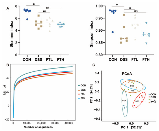 Effect of FBT on the diversity of gut microbiota in mice with DSS-induced colitis. (A) Simpson and Shannon index of gut microbiota. (B) Dilution curve of Gut microbiota. (C) PCoA analysis of gut microbiota. *, p < 0.05; ns indicates that the difference is not significant.