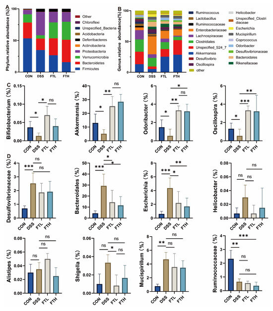Effect of FBT on the gut microbiota of mice with DSS-induced colitis. (A) The bacterial flora at the phylum level. (B) The bacterial flora at the family level. (C) The beneficial bacterial flora at the genus level. (D) The harmful bacterial flora at the genus level. *, p < 0.05; **, p < 0.01; ***, p < 0.001; ns indicates that the difference is not significant.
