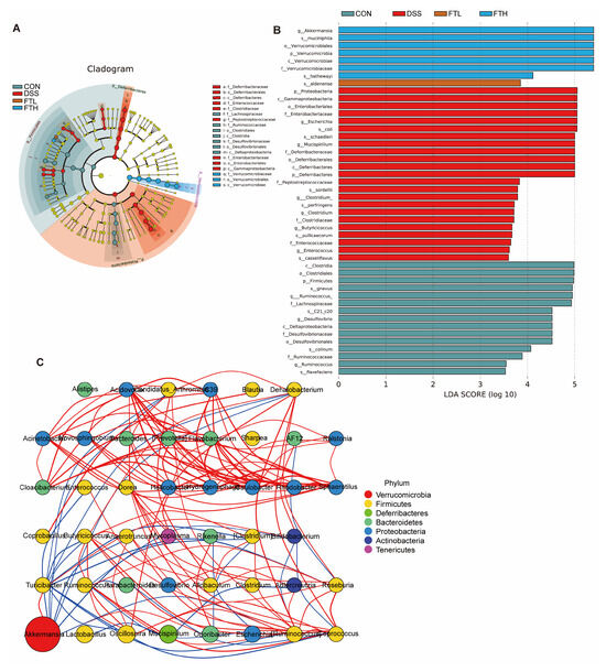 The size of the linear discriminant analysis (LDA) value reflects the degree of contribution of microorganisms to the differences between groups. The larger the value, the more significant the difference of this microorganism between different groups. LDA demonstrated that compared with the CON group, the main characteristic bacterial groups in the DSS group were Escherichia, Clostridium, Mucispirillum, Butyricicoccus, etc., while in the FTH group, they were Akkermansia, Verrucomicrobiaceae, etc. This showed that oral administration of FBT extract could inhibit the reproduction of Escherichia, Clostridium, Mucispirillum, Butyricicoccus, and other bacteria and promote the growth of Akkermansia, Verrucomicrobiaceae, and other bacteria (Figure 7A,B).