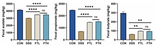Effects of FBT on the content of SCFAs in mice. **, p < 0.01; ****, p < 0.0001; ns indicates that the difference is not significant.