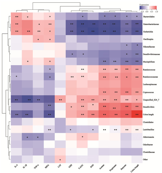 To analyze whether there is a significant correlation between intestinal microbiota species and colitis phenotype data, we calculated the Spearman correlation coefficient between the inflammation phenotype data and the microbial genus levels. According to the results in Figure 9, the antioxidant index showed a consistent trend with the length of the colon, and the inflammatory factor MDA corresponded to the antioxidant index. This suggested that DSS-induced colon shortening can be alleviated by reducing intestinal inflammation and improving intestinal antioxidant properties. Further analysis of the relationship between various factors and gut microbiota demonstrated that Akkermansia and Lactobacillus were negatively correlated with TNF-α and IL-1β and positively correlated with colon length, SOD, GSH, etc. On the contrary, Enterobacteriaceae, Escherichia, Mucispirillum, Desulfovibrionaceae, etc., were positively correlated with TNF-α, IL-1β, and MDA and negatively correlated with colon length, SOD, GSH, etc. This suggested that the increase in Enterobacteriaceae, Escherichia, Mucispirillum, Desulfovibrionaceae, and other bacterial groups might aggravate intestinal inflammation, while the proliferation of Akkermansia and Lactobacillus might reduce intestinal inflammation, thereby improving colon shortening.