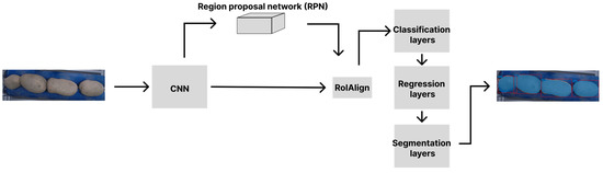 Research has demonstrated the efficacy of Mask R-CNN in agricultural contexts. Studies have underscored its superiority in applications necessitating exact instance segmentation, such as the accurate segmentation of on-tree fruit and the estimation of their size despite occlusions, surpassing the capabilities of the Vision Transformer model [11]. Other studies have demonstrated its usability in conjunction with drones for the identification of invasive weeds in agricultural fields and the isolation of soil regions from complex backgrounds, enhancing preprocessing for soil-type identification. These studies suggest a potential enhancement of crop management when employed in conjunction with aerial drones [12,13]. The studies have also demonstrated the applicability of Mask R-CNN for the detection of crop growth and the estimation of livestock weight. A study was conducted to create an enhanced Mask R-CNN model for estimation of lettuce’s growth status, allowing for optimal harvest timing. In another study, a modified model was designed with the main goal of weight prediction of live pigs. The study incorporated depth images, enhancing the accuracy of the prediction process, a feature lacking in the study of lettuce growth [14,15].