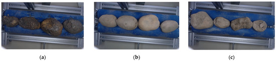 A total of 696 images were collected, with 105 images of rotten potatoes, 375 images of feed potatoes, and 216 images of high-quality potatoes (Figure 2). The distribution of images utilized for training and evaluation of the neural networks is presented in Table 1. Of the total, 521 images were selected for training, comprising all potato categories, with a predominant focus on feed potatoes (70.5%) and rotten potatoes (19.7%). This emphasis was necessary because, in some cases, the difference between mud-covered rollers and the potatoes was minimal, potentially affecting classification accuracy.