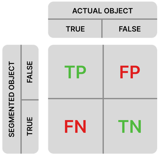 Each segmented object is classified into three categories determined by the comparison of its IoU value and the established overlap threshold [10]: TP (true positive), FP (false positive), and FN (false negative). TN (true negative), which represents background that was not segmented as an object, is also known. A confusion matrix (Figure 4) is used for the classification of the segmented object, which graphically illustrates into which category the segmented object falls.