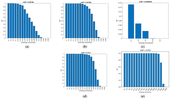 To obtain the mean average precision (mAP) for all specified precision thresholds, the average of all AP values is easily calculated. In the equation used to calculate mAP, the variable N represents the number of calculated AP parameters, which is equal to the number of overlap thresholds used (Equation (5)) [22,24].