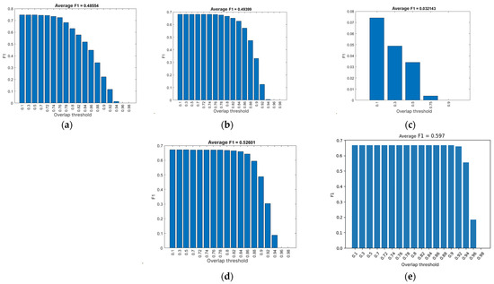F1 score based on overlap threshold: (a) NN1; (b) NN2; (c) NN3; (d) NN4; (e) NN5.