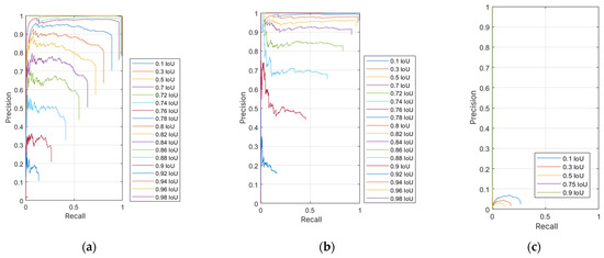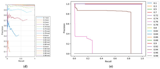 In order to compare the performance of the neural network, the values of AP and F1 were compared at different overlap threshold values. Therefore, it was necessary to create multiple graphs of the relationship between accuracy and recall based on different overlap threshold values.