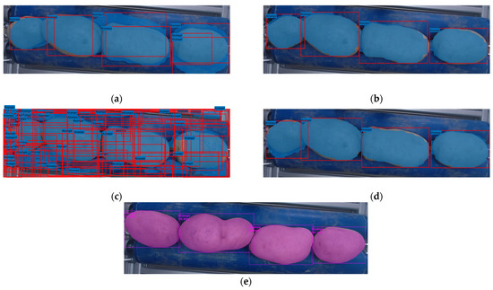 The processing speed of a neural network directly impacts the efficiency of a sorting system. In this study, the trained models demonstrated a processing rate of 6.46 FPS. When utilized in conjunction with a wide-lens configuration, the sorting machine should exhibit the capacity to process multiple potatoes per second, with the precise number adjustable based on the available computational power. The utilization of advanced graphic cards is expected to yield enhanced performance, though it should be noted that this approach is accompanied by a higher cost for the sorting system. Testing on images that had not been previously encountered confirmed the efficacy of a region-based convolutional neural network in accurately segmenting potatoes within a realistic production environment. The subsequent stage involves integrating the neural network into an actual production process and evaluating the performance of the entire sorting system. While the focus would be integrating Mask R-CNN into a production environment, numerous industrial food-sorting systems rely on the use of classical computer-vision techniques (e.g., threshold-based segmentation and SVM-based classification). The good quality of such techniques is their ability to exhibit low computational demands, allowing for a higher quantity of produce being processed in equal amount of time. However, research has demonstrated that classical computer-vision techniques encounter challenges in complex segmentation tasks, particularly in scenarios involving occlusion, overlapping, and variable lighting conditions [28,29]. Conversely, deep learning models, such as Mask R-CNN, exhibit a marked advantage in addressing these issues by learning spatial relationships within the image and generating precise segmentation masks for each instance, albeit at the expense of a longer processing time. Leading industry entities such as TOMRA (TOMRA Systems ASA, Asker, Norway) and Key Technology (Key Technology, Walla Walla, USA) employ a suite of vision-based sorting techniques, including hyperspectral imaging and classical computer-vision algorithms, to automate food sorting at an industrial scale. While these systems are optimized for speed and efficiency, the focus of this work is on integrating deep learning-based segmentation methods, such as Mask R-CNN, which have the potential to enhance defect detection, produce classification, and object appearance handling.